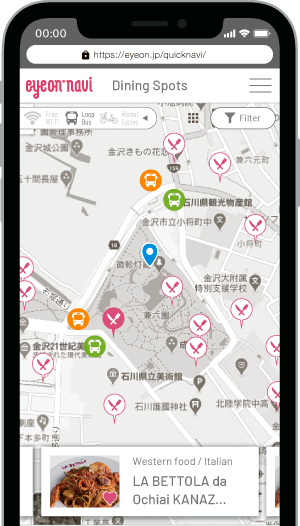 Try our new “eyeon® navi” for smartphones. Discover more about the restaurants and facilities introduced on the “Dining Out,” “Food Diversity in Ishikawa,” and “Day Trip from Kanazawa” pages and find information on accommodation, all at once on your smartphone!