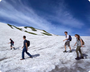 Theroute opens in mid-April after a snowy winter. Flowers may be blooming at the foot of the mountains, but you can still enjoy walking through the snow at Murododaira, one of the snowiest places in the world. A highlight of this season is the gigantic 500 m-long snow wall, which materializes due to removing snow from the road. As the season shifts, trees sprout new leaves, contrasting with the remaining snow. From June to September, alpine plants bloom throughout the short summer. Walkers admire flowers around Mikurigaike, filled with thawed water, and the Midagahara wetlands. Fall comes early in the mountains. From September to November, leaves slowly change color from the summit. Shomyo Falls, the highest in Japan, looks most stunning during this season. Around November, autumnal colors spread at the foot of the mountains while the Murododaira plateau is covered with fresh snow.