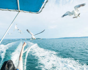 Situated along the coastline of the hot spring town, Nanao Bay is a key attraction offering sightseeing boat trips for visitors to appreciate a view of the bay with a backdrop of the Noto Peninsula. In the summer, visitors can take a leisurely cruise from the port to watch seagulls and view a glorious sunset. Passengers enjoy feeding seagulls that come close to the cruiser.