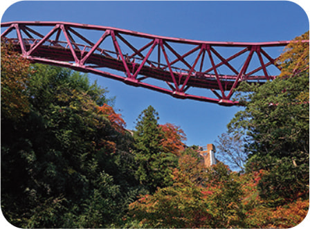 A scenic walking path follows the Daishoji River as it winds through the gorge. This path features three bridges, including the iconic Ayatori Bridge, and offers breathtaking views in every season. In the fall, you can admire the stunning autumn foliage while enjoying refreshments at the “Kawadoko” riverside café. Hannah delights in walking this path almost every day.