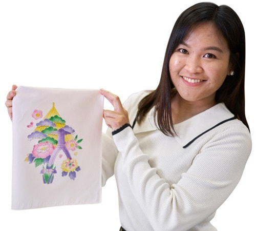 Hello! I’m Veronica from the Philippines. I’ve been living in Japan for more than five years. I attended the Kaga-Yuzen workshop at the Kaga-Yuzen Kimono Center in Koshomachi. Kaga-Yuzen is a fabric dyeing technique unique to Kaga that is based on five colors that they call “Kagagosai.” The five underlying tones consist of indigo, crimson, dark green, ocher, and royal purple. Upon entering the facility, the first thing I noticed was the intricate designs of the kimonos that were exhibited in the hall. The designs on those fabrics highlight the delicacy and elegance of Japanese culture. I have learned that several of the kimonos displayed were made hundreds of years ago by some of the great masters of Kaga-Yuzen.