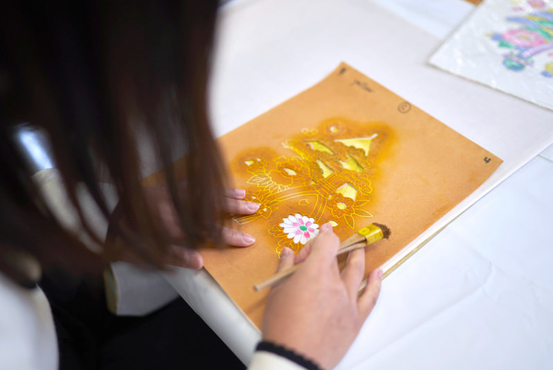 Before the workshop, I became familiar with the process of yuzen and was impressed by how tedious and detailed the process is. I was able to experience the stencil dyeing technique on a handkerchief, which is easy for first-timers. Stencil dyeing is done with a pre-designed pattern. You can choose to paint on either tote bags or handkerchiefs, and you can choose from different designs, such as cherry blossoms, the Hyakuman-san, and the famous Kotoji Toro in Kenrokuen. For someone who had no experience in painting fabrics, I felt a little nervous as I sat down facing the tools.