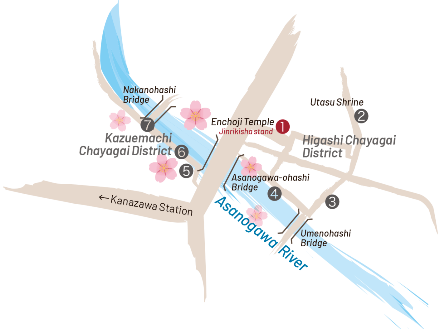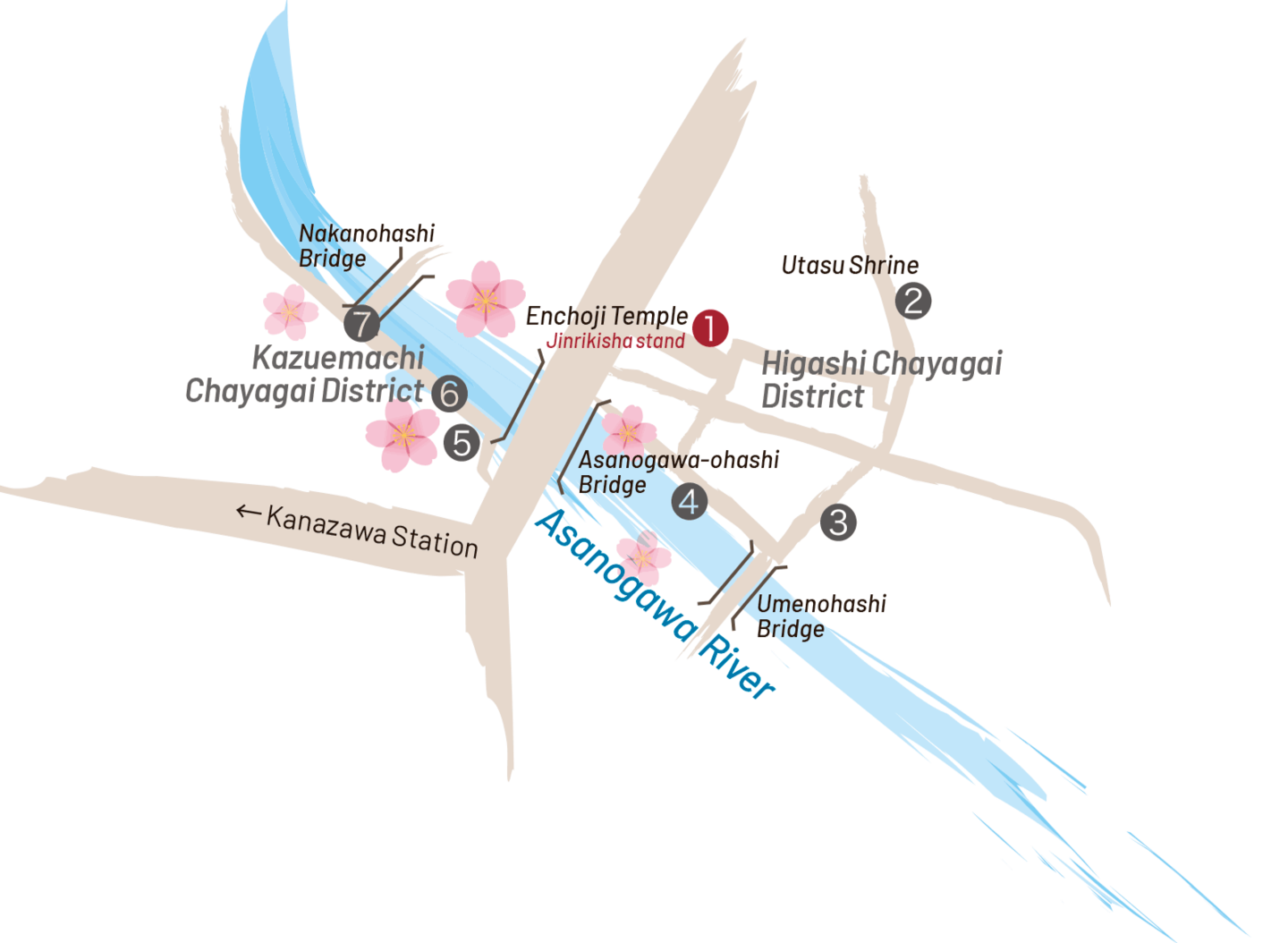 Our journey commenced at Enchoji Temple in Higashiyama and then headed to Utasu Shrine, dedicated to Maeda Toshiie, the first lord of the formidable Kaga Domain, and his wife. It’s a place where people pray for a harmonious marriage. Next, we visited the renowned Umeno Bridge, an old wooden bridge often featured in Japanese historical movies and dramas. Then, we caught a glimpse of another intriguing old wooden bridge, the Nakano Bridge. Lastly, we made our way to the Kazue-machi Chaya District, one of Kanazawa’s three famous teahouse districts.
