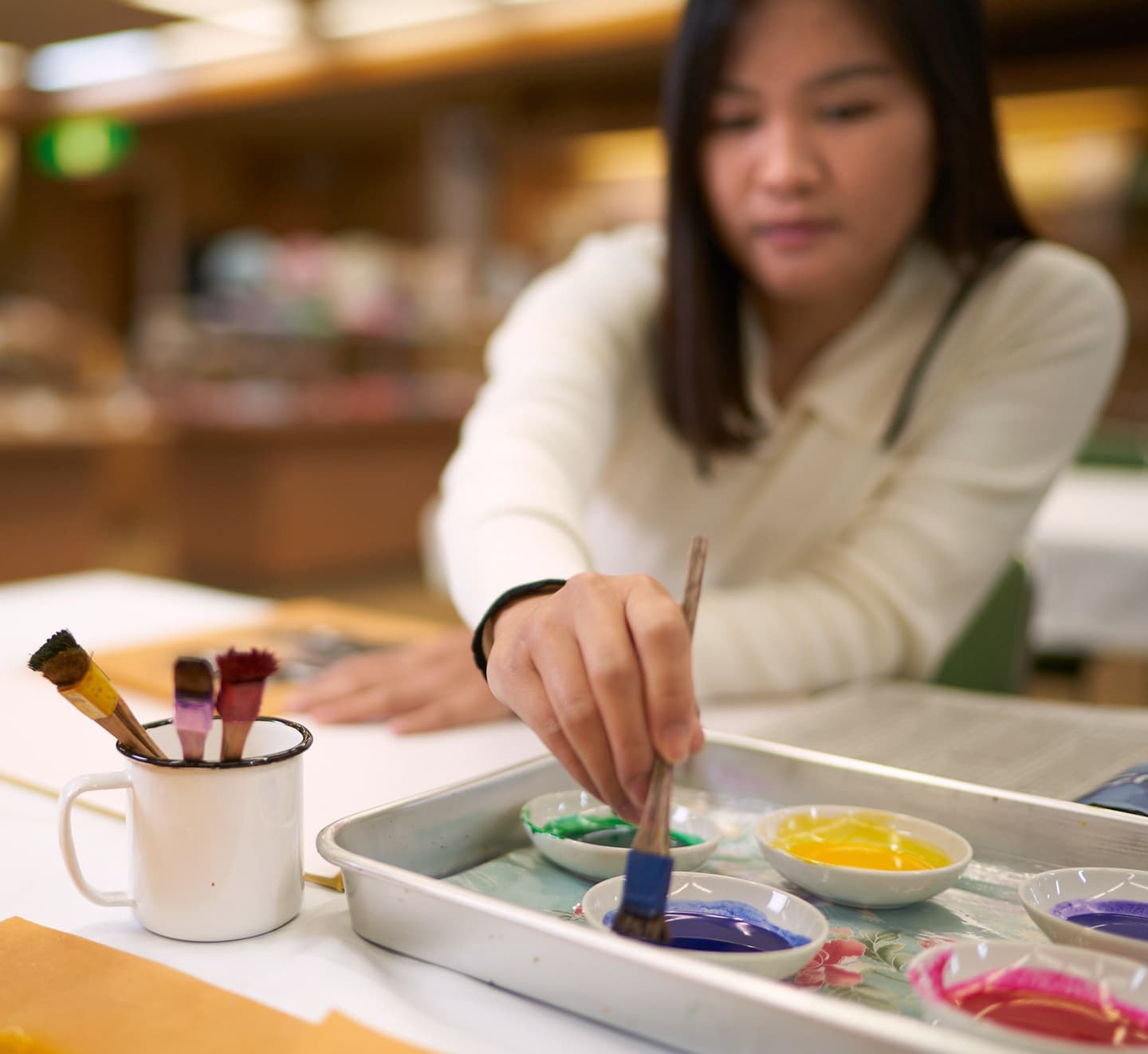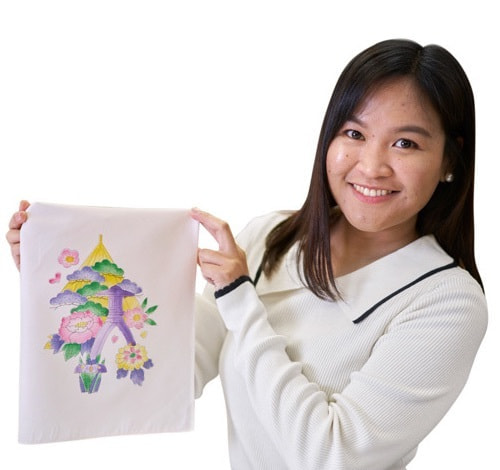 Hello! I’m Veronica from the Philippines. I’ve been living in Japan for more than five years. I attended the Kaga-Yuzen workshop at the Kaga-Yuzen Kimono Center in Koshomachi. Kaga-Yuzen is a fabric dyeing technique unique to Kaga that is based on five colors that they call “Kagagosai.” The five underlying tones consist of indigo, crimson, dark green, ocher, and royal purple. Upon entering the facility, the first thing I noticed was the intricate designs of the kimonos that were exhibited in the hall. The designs on those fabrics highlight the delicacy and elegance of Japanese culture. I have learned that several of the kimonos displayed were made hundreds of years ago by some of the great masters of Kaga-Yuzen.