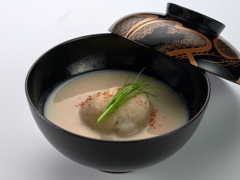 When it comes to presentation and tableware there are many things to consider, like the season, the ingredients available, the guests age, gender, preferences, etc., the occasion of their visit and many more. Here I am always talking to the proprietress to ensure that I cook the best dishes possible for the guests coming that day. This finetuning makes Kaiseki cuisine very challenging, but also allows you to be very creative and flexible. In preparing the meals there of course are basics that you have to adhere to, but the guests experience, and enjoyment comes first and plating everything the same way every time also becomes boring for both us in the kitchen and the guest who come more frequently. Here Kaiseki is not unlike French cuisine in that variation and playfulness is encouraged. Also, just like in any field there is no real right way in cooking and presenting the meals. Every chef has their own way of doing things and to express themselves. When it comes to the dishes and the tableware itself, I always aim to convey both the seasonality through the best ingredients and the appropriate forms of tableware. In summer there might be more glass plates and urushi lacquer bowls with fitting designs in Kaga maki-e which give off a cool image, while in autumn and winter I use more earthenware which have a warmer feeling to them. Here I want the guests to experience both the beauty and the skill put into these pieces of tableware by the craftsmen that made them as well as giving the guests the opportunity to see as many interesting items as possible by utilizing many of them during one course.